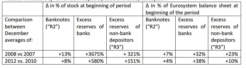 En l'informe es mostra la fragilitat d'aquests dipòsits en la crisi de 2008. En el gràfic podem observar les fuites de dipòsits el període 2008 i 2011. La taula captura la importància dels tres tipus de fuites; de dipòsit a metàl·lic, de bancs febles a bancs forts i la fugida a no-dipòsits bancaris. Observem que la fuita de dipòsits bancaris a metàl·lic (R2) és menor que els altres dos factors, la fugida major ocorre entre els bancs febles i els forts. En el cas que ens ocupa, el banc central és indiscutiblement més fort que el banc comercial.